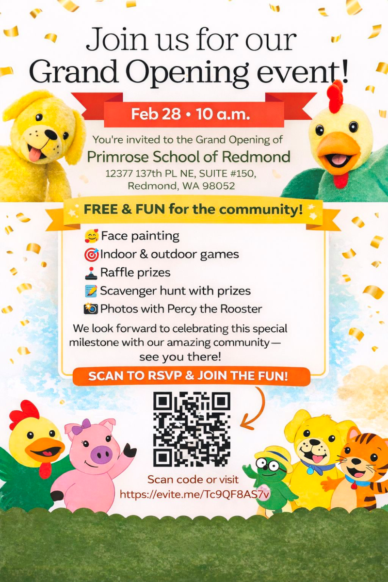 Join the community in celebrating the Grand Opening of Primrose School of Redmond on Saturday, February 28 at 10:00 a.m. This free, family-friendly event will feature a variety of fun activities including face painting, indoor and outdoor games, raffle prizes, a scavenger hunt, and photo opportunities with Percy the Rooster.
