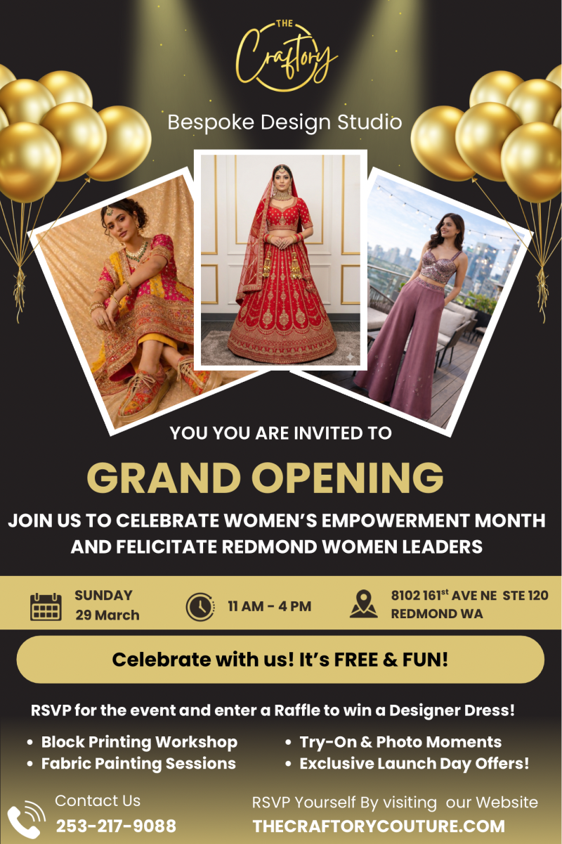 From the business owner: RSVP for the event and enter a Raffle to win a Designer Dress! RSVP yourself by visiting our website www.thecraftorycouture.com.