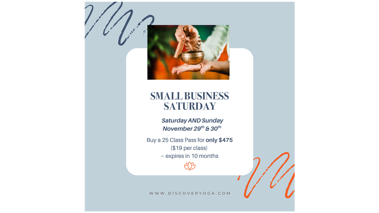 Support our small business and your yoga practice by taking advantage of our special. Offer only valid on Saturday November 29th and 30th!